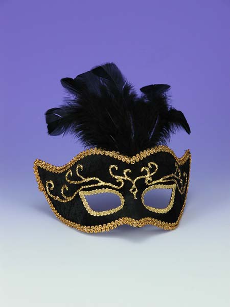 This half style mask is Black with Gold accents and feathers. The mask has an attached, rigid plastic, ‘U’ shaped headband which allows the mask to swivel down over the face or up over the head.