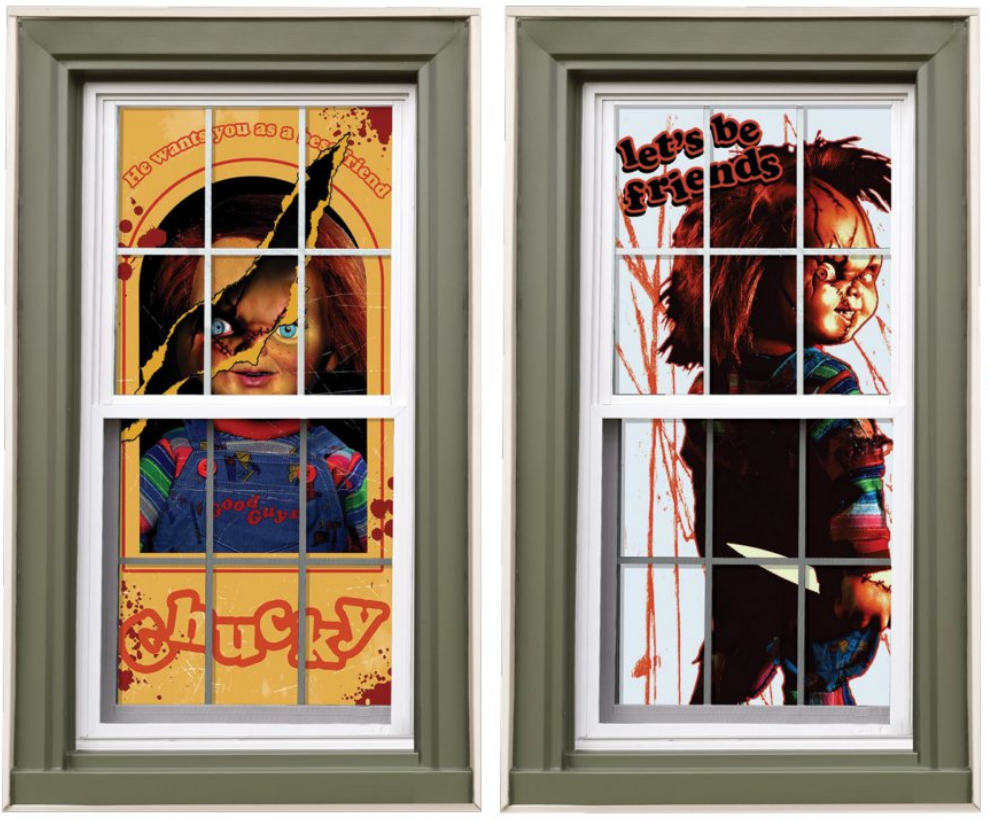 | Wanna play? These Chucky window silhouettes measure 33.5″ x 65″ (85cm x 165.1xm). Includes two window silhouettes (great for doorways too!) | ![]() |