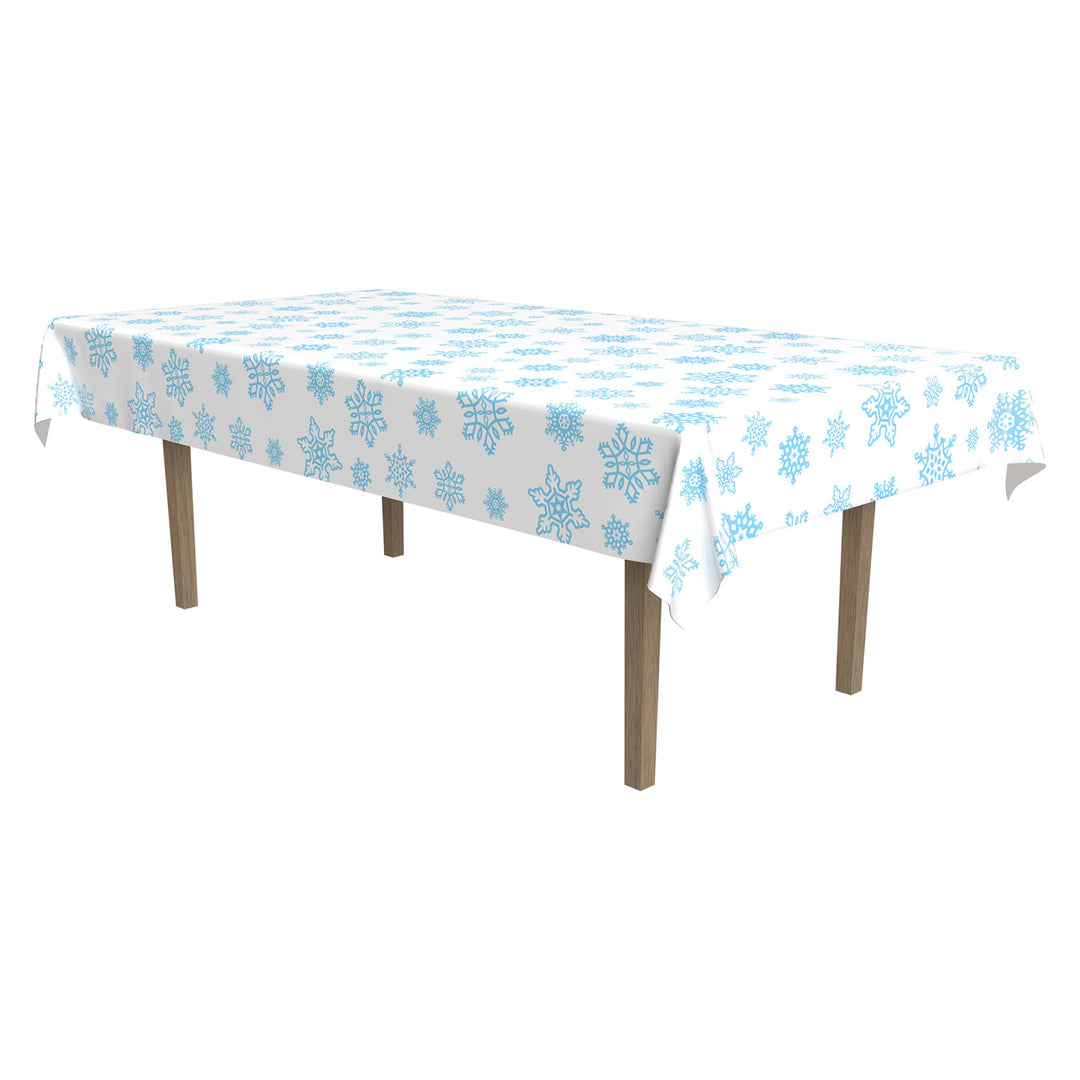 Give your table setting a whimsical and romantic look with our winter wonderland inspired Snowflake Plastic Table Cover. Add your own blue, silver or white color accents or match with our Snowflake Paper Goods. Each plastic Winter Wonderland Table Cover is 4.5′ x 9′ in width and length.