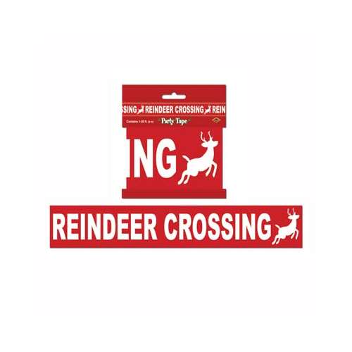 All-Weather party tape featuring white reindeer and “Reindeer Crossing” on a red background. Measures 20′.