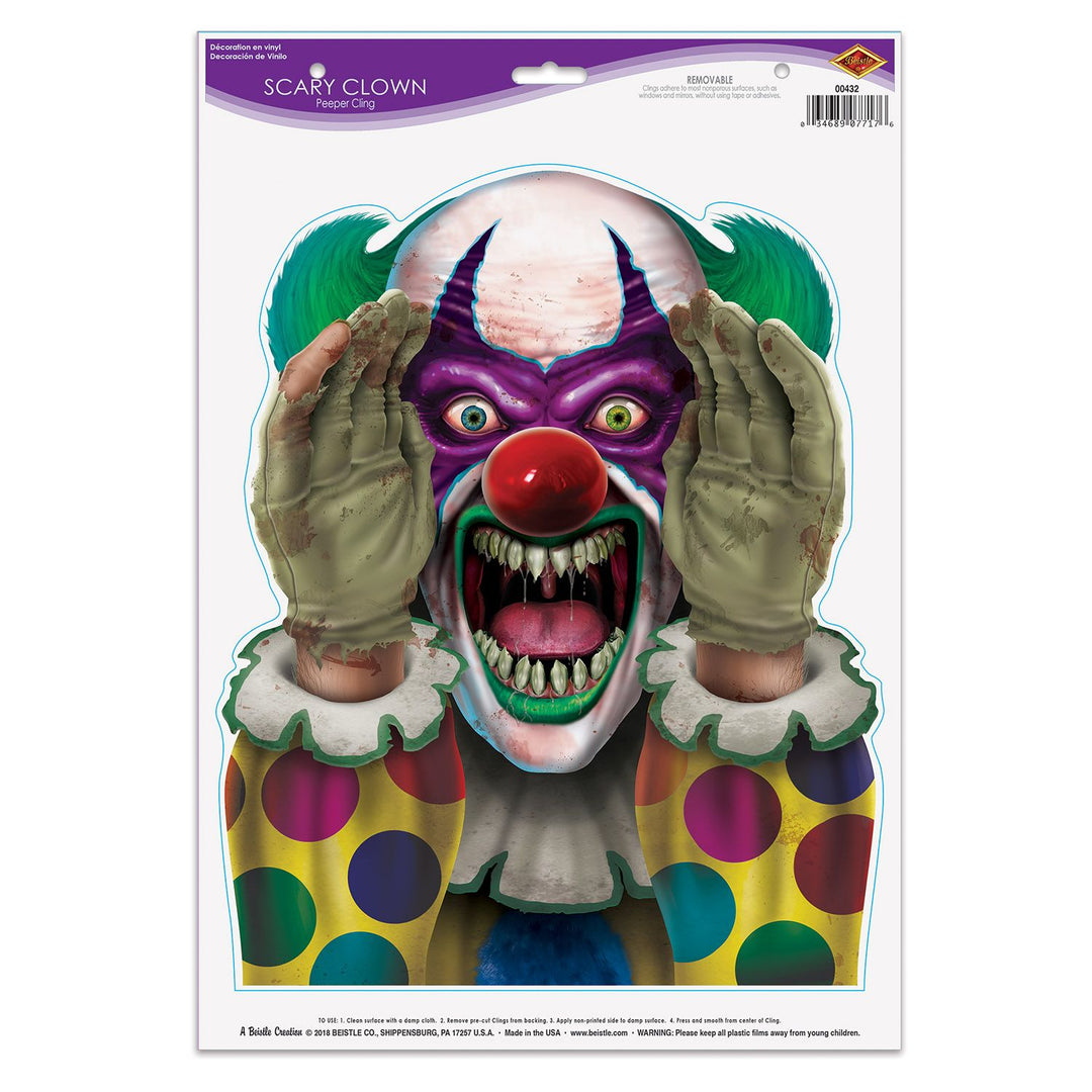 Give your guests a scare this Halloween with the Scary Clown Peeper Cling! It can be used to decorate your windows or mirrors and it will add a frightening embellishment to the room.