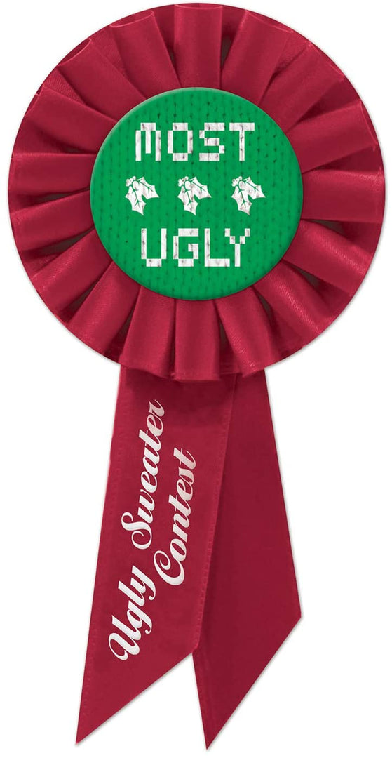 This red satin rosette is printed with “Ugly Sweater Contest” and has a round green plastic center printed with “Most Ugly” in white. The rosette measures 6.5″ long by 3.25″ wide. Perfect for Christmas parties!