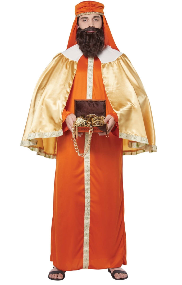 The wise man from India, The Gaspar costume includes a decorated robe, cape with trim and a turban.