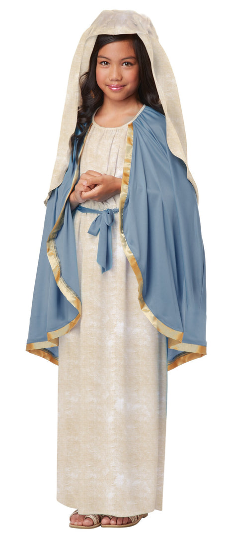 The Virgin Mary child biblical costume includes a dress with an attached blue cape with gold trim and headpiece. Sandals not included.
