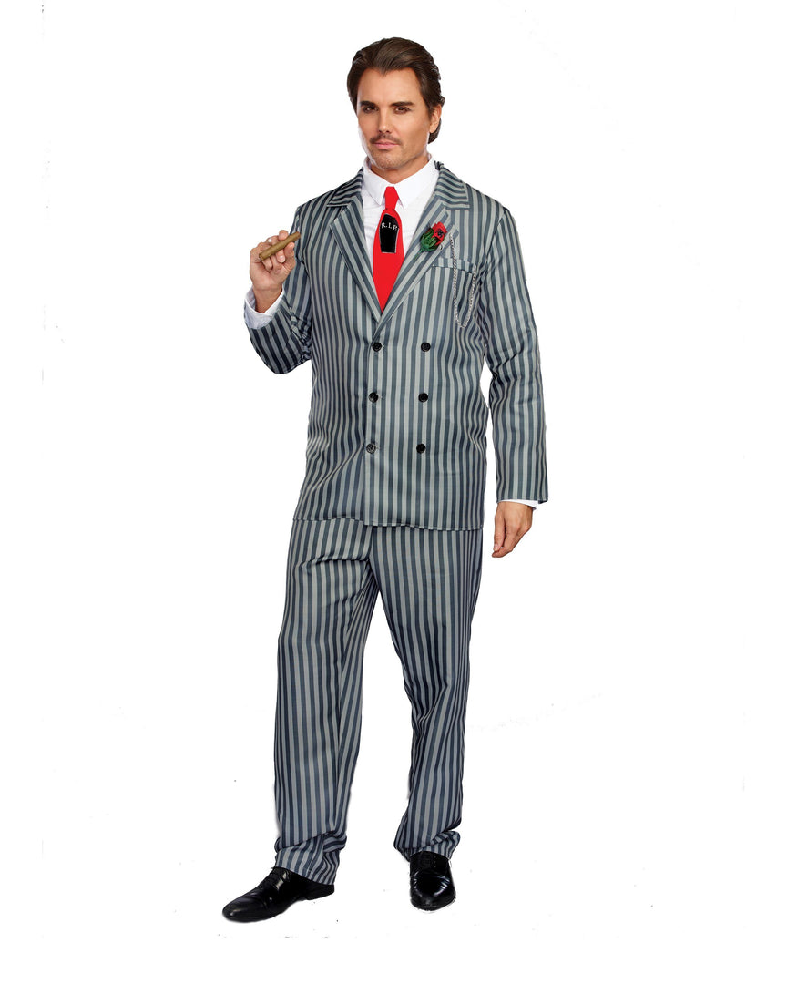 Dreamgirl’s “Mr. Fright” features a kooky double-breasted suit jacket with gray pinstripe print and rose boutonniere with an attached spider.