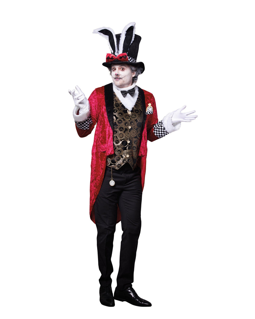 - Includes matching top hat with rabbit ears and fake pocket watch with chain fob