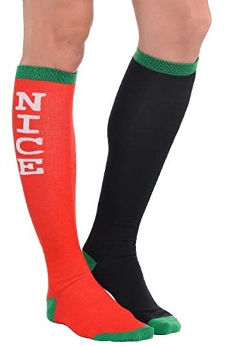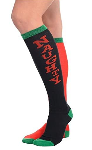Naughty/Nice Socks. 70% acrylic, 28% polyester, 2% spandex. Machine wash, line dry. One size fits most.