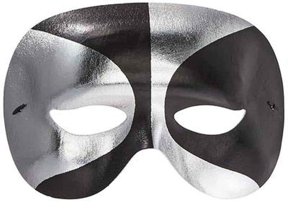 This black & silver eye mask is made of a fabric laminate over a plastic flexible form. Mask covers cheeks & forehead. One size fits most.