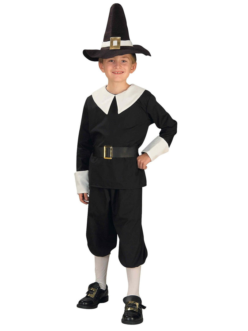 Step up, pilgrim and take a look at this historical costume! A top, britches, hat and black belt are all included in the outfit. The Pilgrims were the first European settlers at Plymouth Rock, Massachusetts, and the second successful English colony in America. These men and women were looking for freedom of religion. At the start of the journey, there were 121 passengers on two ships, but one ship got damaged so 102 boarded the Mayflower to set sail to the New World. Many died after a harsh winter in America, but the colony persevered. Native Americans helped them through the first winter and taught them to farm corn; they celebrated that fall with a Thanksgiving dinner. Take some family pictures on Thanksgiving with your kids dressed as pilgrims and Native Americans or purchase this for a play at school.