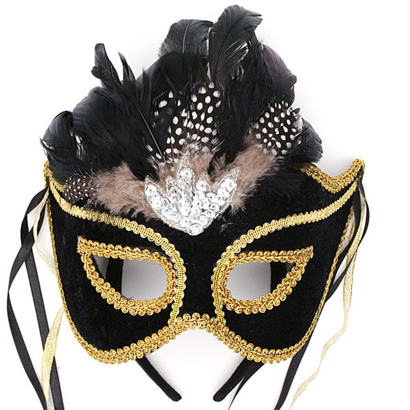 Beautifully crafted, this Velvet Venetian Colombina-style Mask features gold trim. Feathers in black, beige and polka-dotted accent the center of the mask. The soft, cloth covered headband provides a comfortable and secure fit while giving the wearer the ‘no-fuss’ option of raising or lowering the mask without removing it!