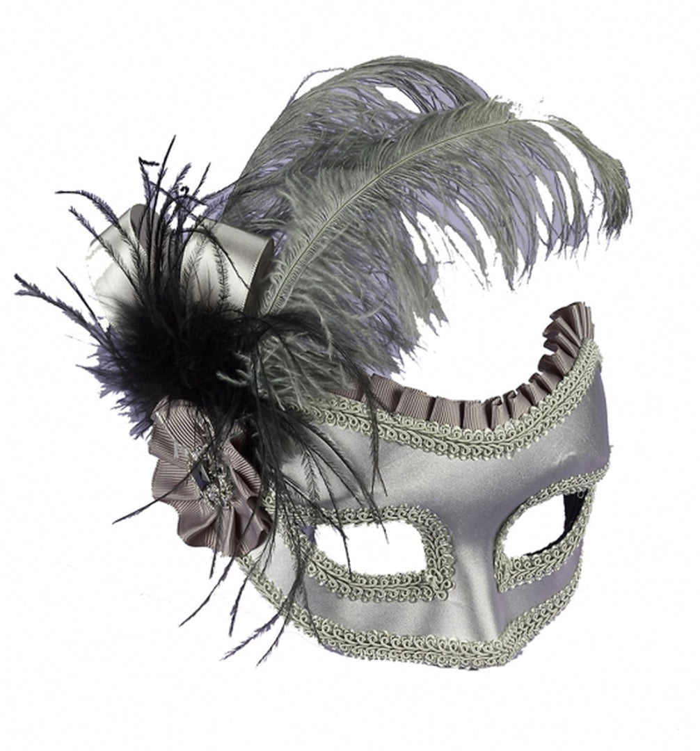 Beautifully crafted, this grey Venetian Mask features grey embroidered trim. The mask features ribbon, feathers, and a jewel on the side of the mask. Plastic eye glass arms provides a comfortable and secure fit.