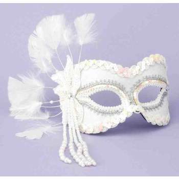 Beautifully crafted, this white with silver accents Venetian Half Mask features iridescent trim for a simple yet elegant look. Feathers adorn the side. The soft, cloth covered headband provides a comfortable and secure fit while giving the wearer the ‘no-fuss’ option of raising or lowering the mask without removing it!