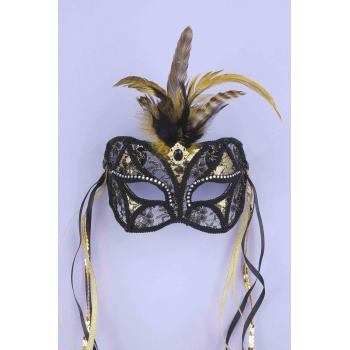 Beautifully crafted, this Venetian Colombino-style Mask features gold background with black lace overlay and embroidered trim. Gold and black feathers adorn the top. The soft, cloth covered headband provides a comfortable and secure fit while giving the wearer the ‘no-fuss’ option of raising or lowering the mask without removing it!