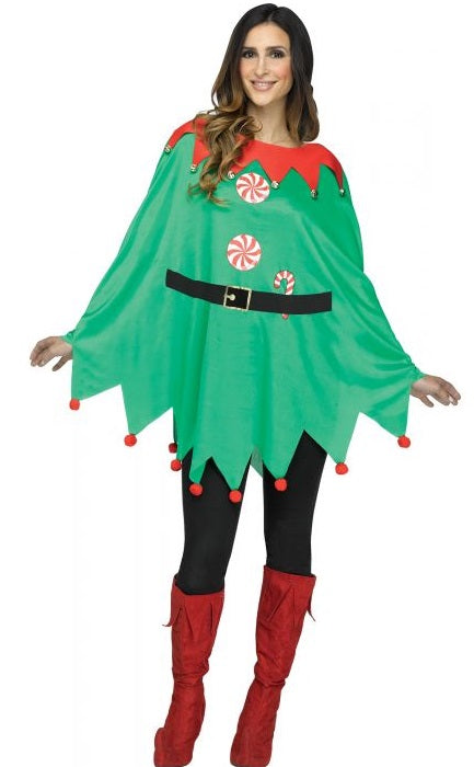 This fun screen-printed poncho features candy cane print and red pom-pom accents at the hem, a print belt and red collar with jingle bells. (One size fits most)