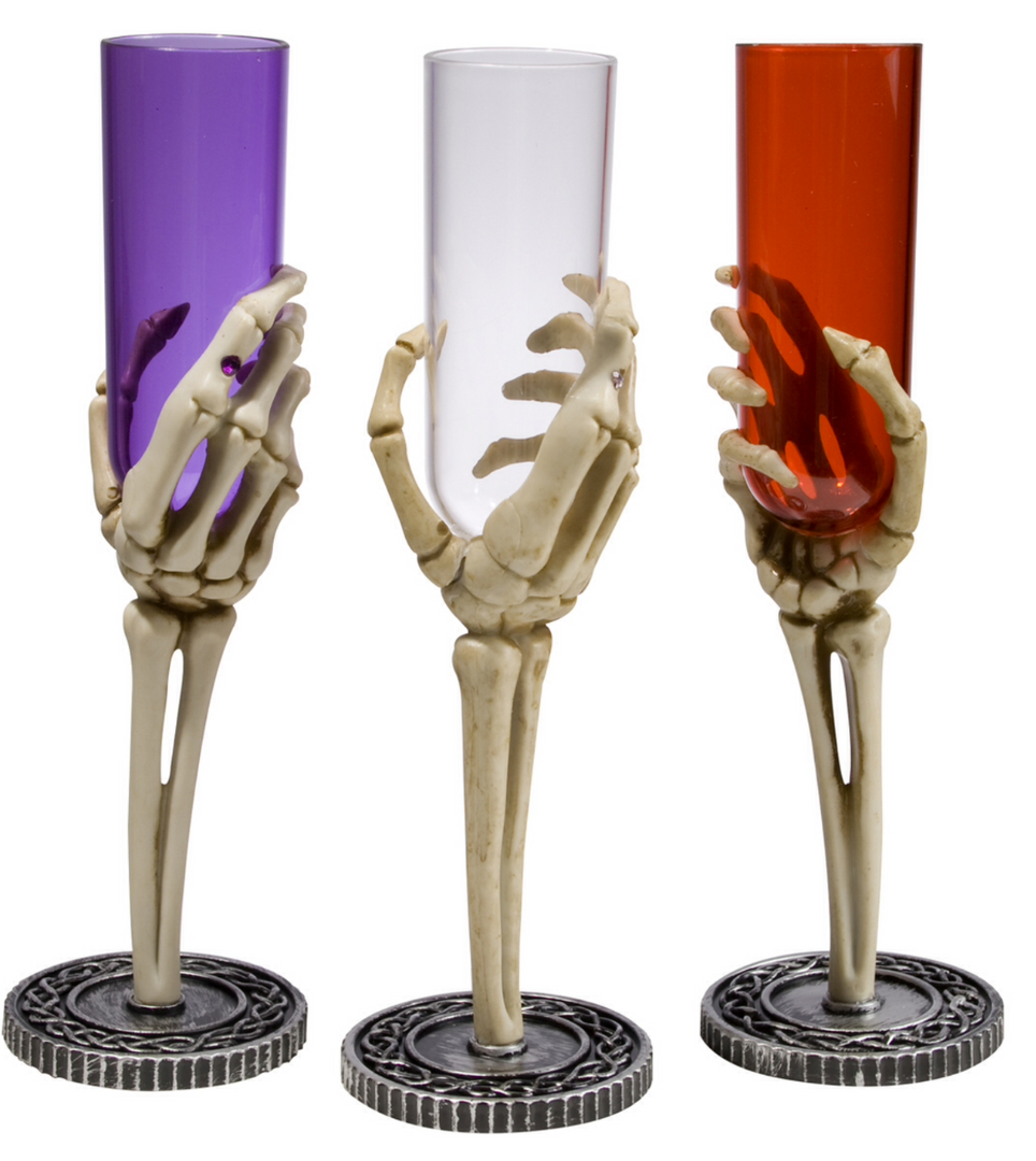 Scare up some chills with these Skeleton Hand Fluted Glasses. This plastic flute measures 9.75″ tall and adds a spooky touch to your table decor. Now you can toast to that special occasion on All Hallow’s Eve with these gruesome goblets. Complete with a plastic skeleton hand base and plastic vial for your favorite beverage. These glasses are ideal for Halloween parties, themed weddings and other gothic events!