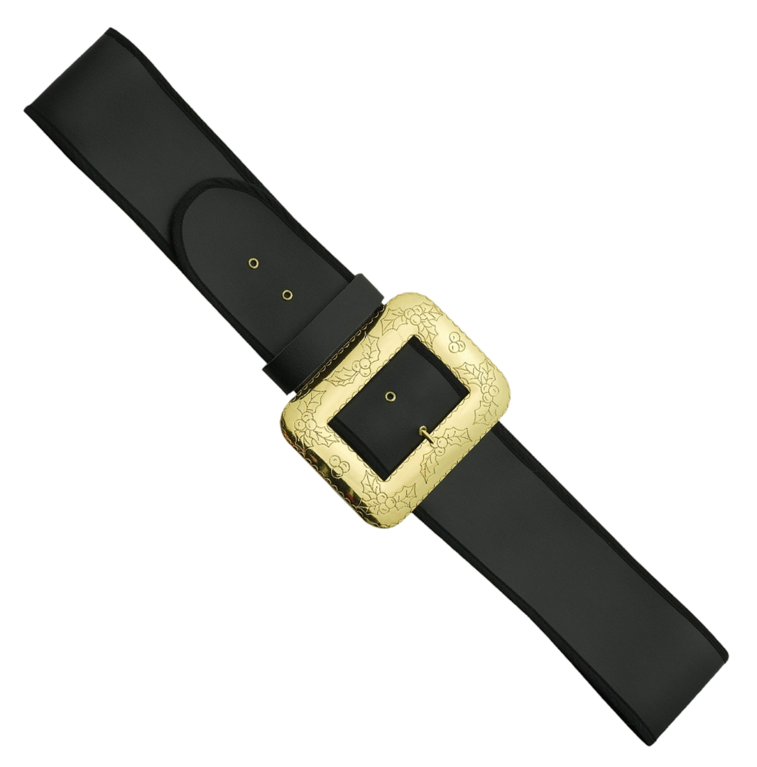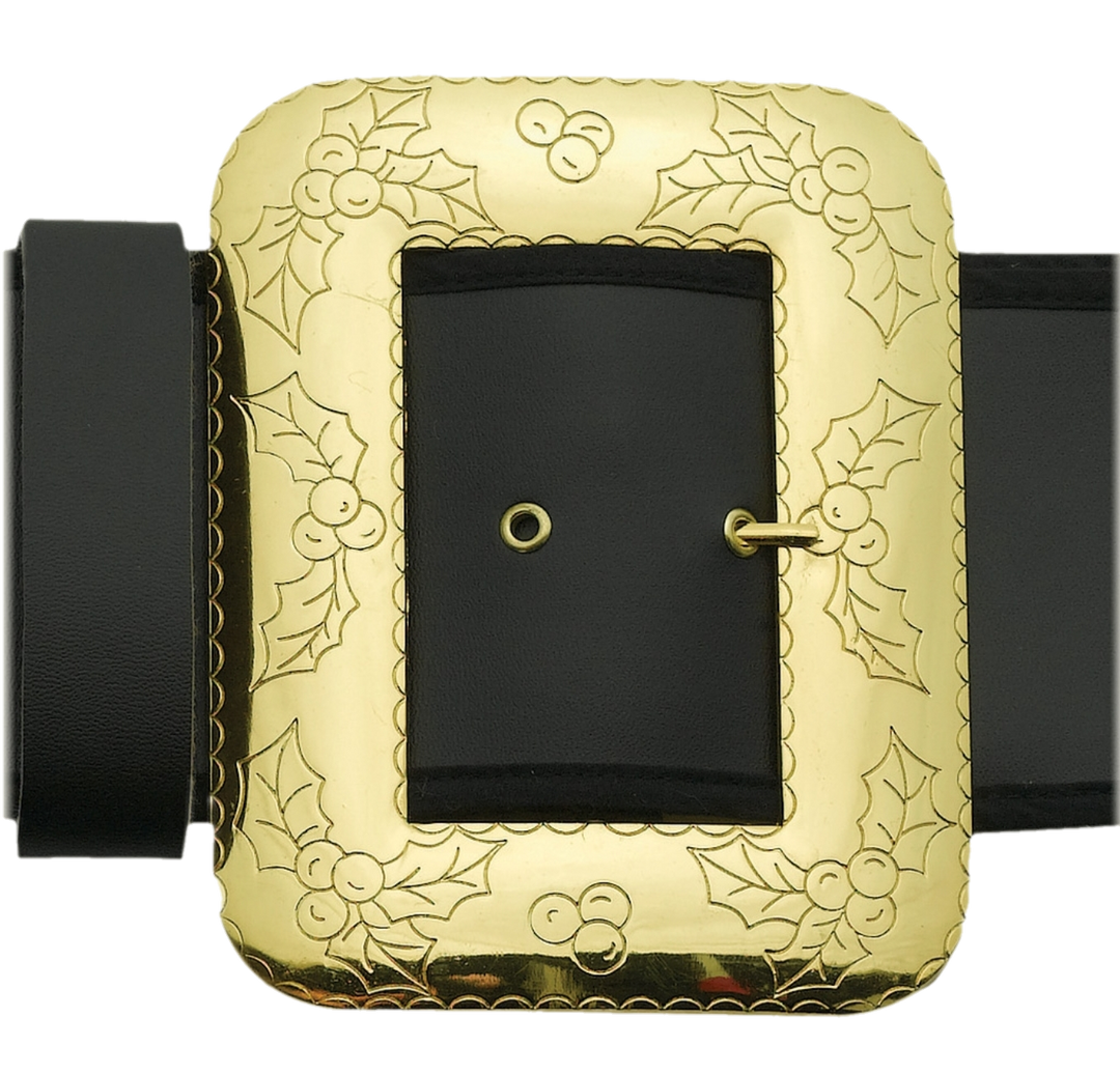 4″ wide black Naugahyde Santa Claus belt with elaborate large cast buckle w/prong, 6 gilt eyelets and belt loop.