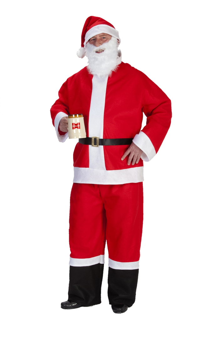 This super economy Santa Claus costume is perfect for a Christmas pub crawl, Santa Con or Christmas Party! The Saloon Spree Santa features a pullover coat with side-pocket and attached boot tops with matching trim, hat with pom-pom, vinyl belt with plastic slide buckle and economy beard with elastic strap. (Beer Stein NOT included)