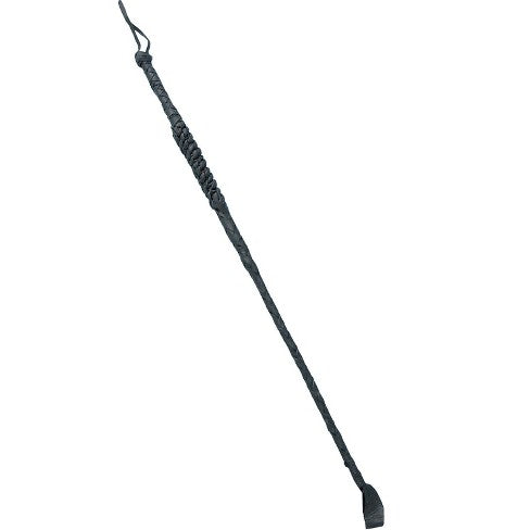 Costume grade black leather riding crop. Braid construction with wrist strap & “stinger” end. Looks great! Perfect accessory for jockey costumes or for a party prop.
