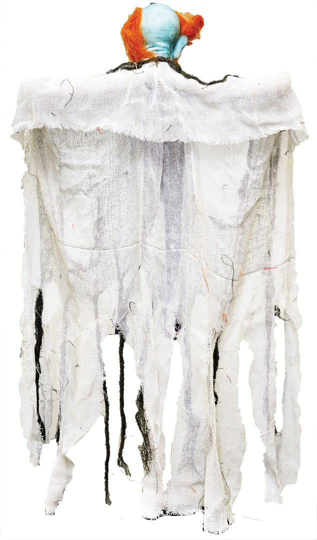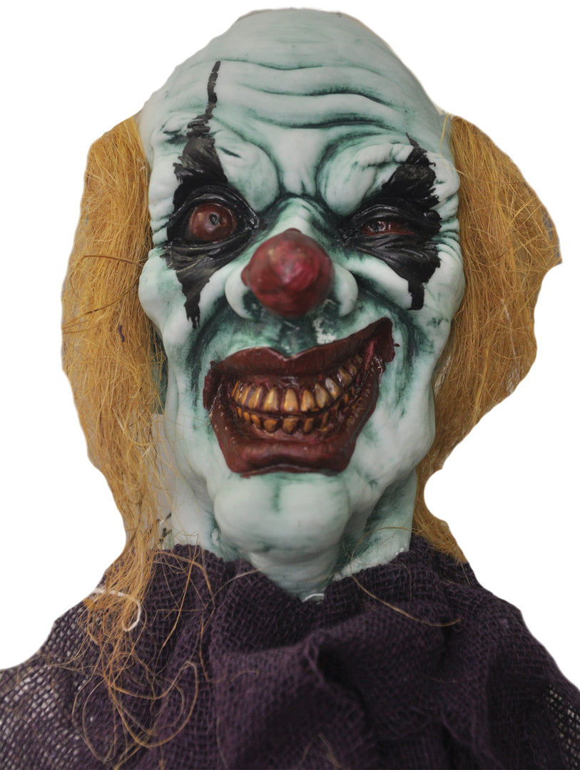 Hanging devil clown with white clothing. 36 inches. Vinyl head and plastic hands.