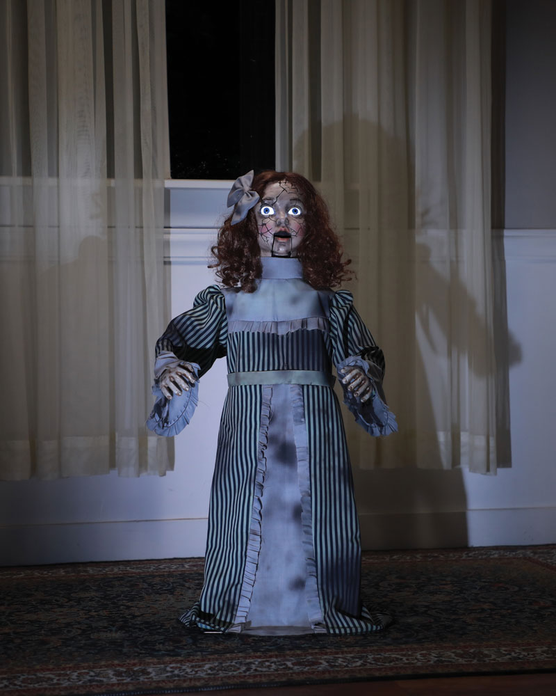 The 36-inch Vintage Animated Doll Prop has an injection-molded and blow-molded plastic frame with bendable wire arms and a fabric antique-looking costume. On has a sensor activation, and off position has a Try-me activation. Requires 3 AA Batteries, not included.