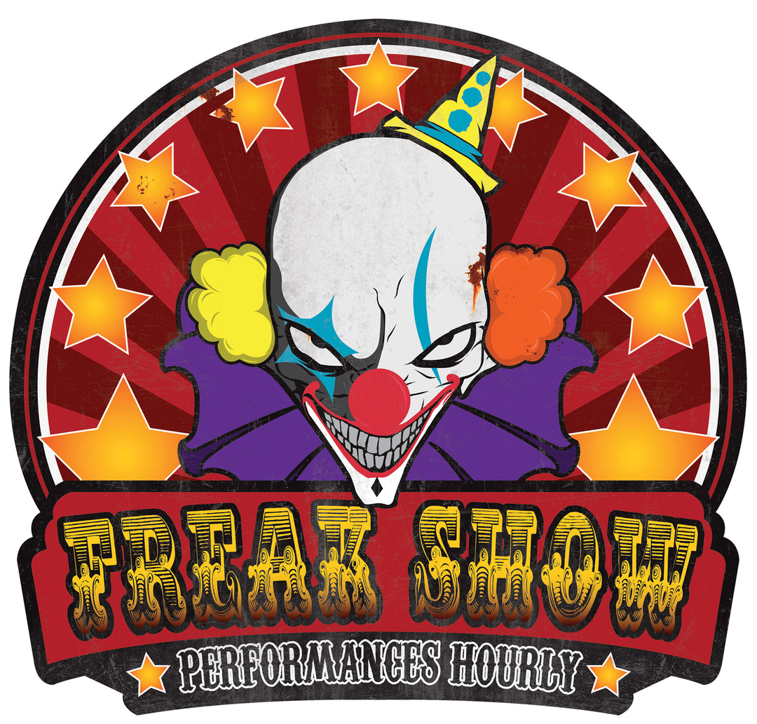A great sign for your haunted house home haunt display or even a great Halloween party! Sign shows demented looking clown on colorful background and says inches. Freak Show – Performances Hourly. Approximately 21.5 inches long and 23 inches wide.