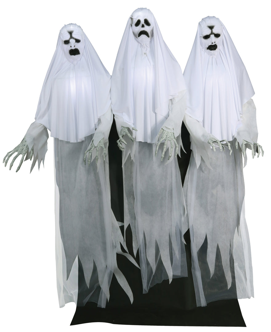 Now you can have a whole gaggle of ghosts at your door or on your porch with The Haunting Ghost Trio! These three 6 foot Ghost characters have fabric-covered PVC heads with light-up faces & torsos draped white fabric costumes posable arms with creepy plastic long-fingered hands and a black fabric drape to hide the easy-to-assemble frame. Plug in the UL power adapter into any standard outlet & choose from Steady-On Infra-Red Sensor or Step-Here Pad (included) activation options to operate. Once activated, the Haunting Ghost Trio will begin moaning as their faces and chests light up with an other-worldly glow as each Ghost sways from side to side, wailing in eternal torment! The infra-red sensor works up to 6.5′ feet away & works in all lighting conditions – bright light to no light! Item includes volume control. Easy-to-assemble quick-connect poles. Assembly required.