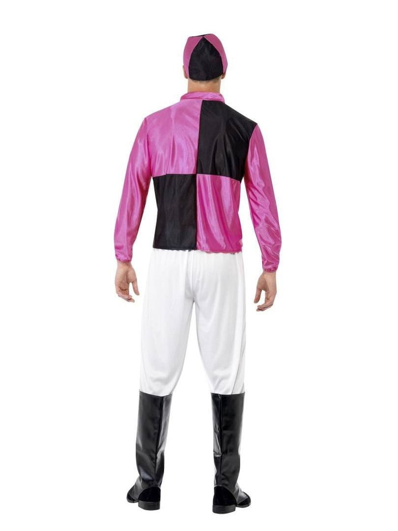 This deluxe quality adult jockey costume includes a pink & black color block jockey silk, white trousers, black deluxe boot tops, black goggles, and matching jockey cap. Available in medium (chest size 38”-40”, 32 3/4” inseam) & Large. (Chest size 42”-44”, inseam 33”)