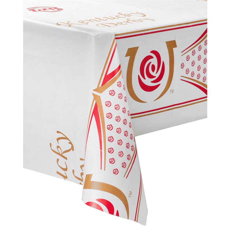 If you only want one decoration for your Kentucky Derby event, make it this unforgettable Kentucky Derby tablecloth. Brilliant white, red and gold colors will capture all your party guests’ attention no matter what table you decorate while you enjoy a clean table and effortless cleanup after the horse racing event. Enjoy this and all our Kentucky Derby decorations by shopping our full selection of Kentucky Derby party supplies online! Plastic. 54″ x 108″